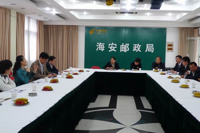 2012年4月13日上午,太阳成集团tyc122cc现代远程教育江苏校外学习中心在南通市海安县邮政局举行邮政大专化校企合作项目座谈会。北邮网络(继续)教育学院党委书记兼副院长邓丽敏、北邮网院江苏校外学习中心(江苏邮政职工教育培训中心)副校长潘尚林及教务部主任吴玉明、南通邮政局人力资源部主任顾少芳及副主任许卫权、南通市各区、县邮政局人力资源部负责人等共17人参加了座谈会。座谈会由江苏省邮政职工教育培训中心副校长潘尚林主持。