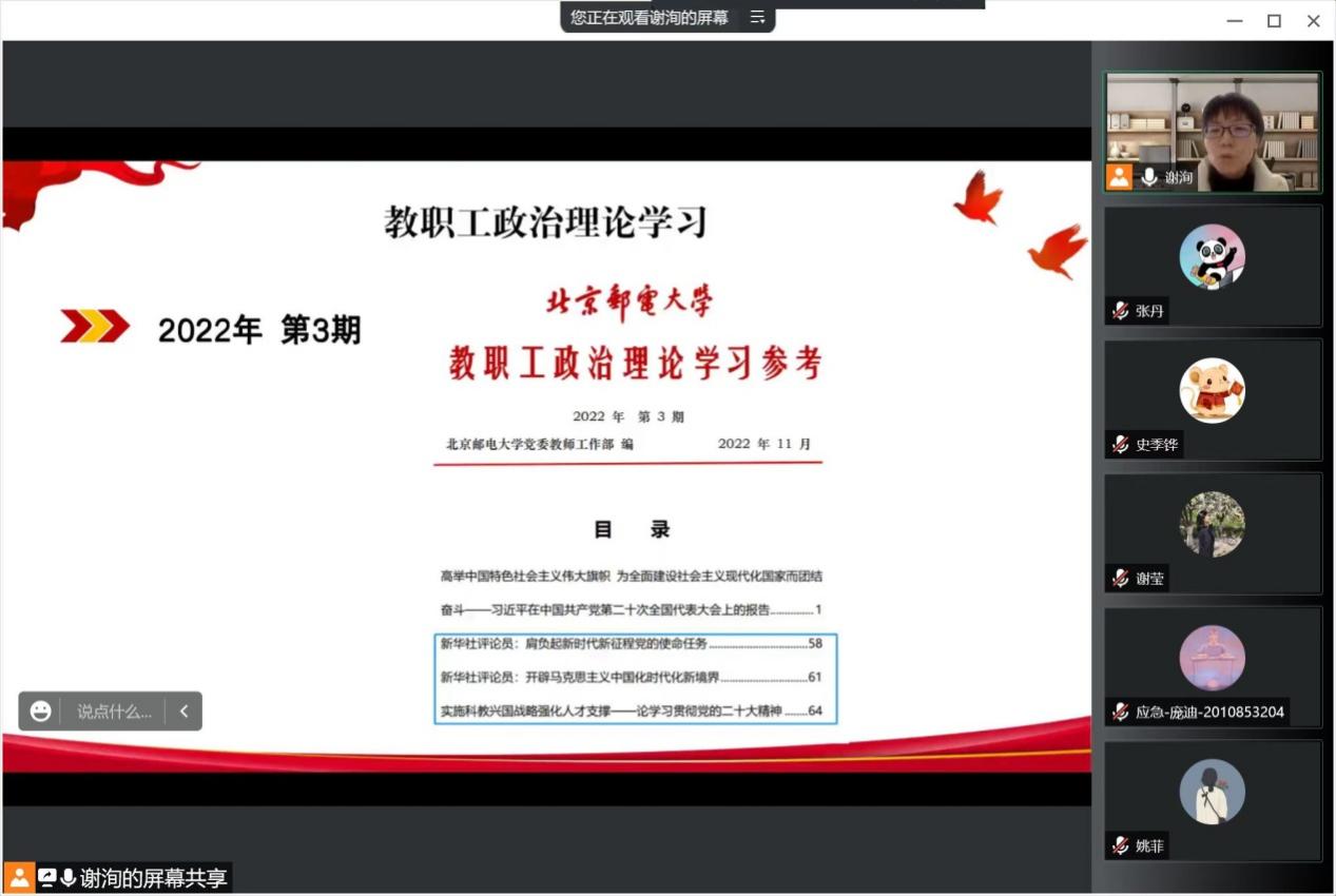 首先,谢洵同志向大家通报了教工第一党支部近期工作情况,介绍了两位入党积极分子的培养情况及联系人调整安排。明确了支部的后续活动安排,部署开展“鸿雁小课堂”二十大报告主题系列党课学习活动。