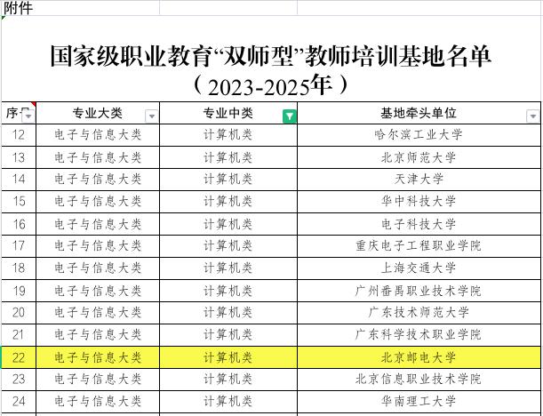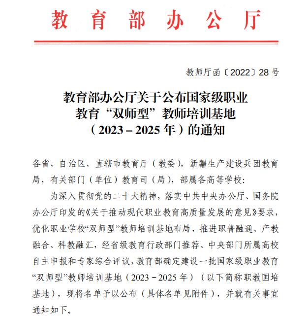12月7日,教育部办公厅发布“关于公布国家级职业教育“双师型”教师培训基地(2023-2025 年)的通知”【教师厅函〔2022〕28号】,公布了国家级职业教育“双师型”教师培训基地(简称职教国培基地)名单,我校获批电子与信息大类(计算机类)培训基地。