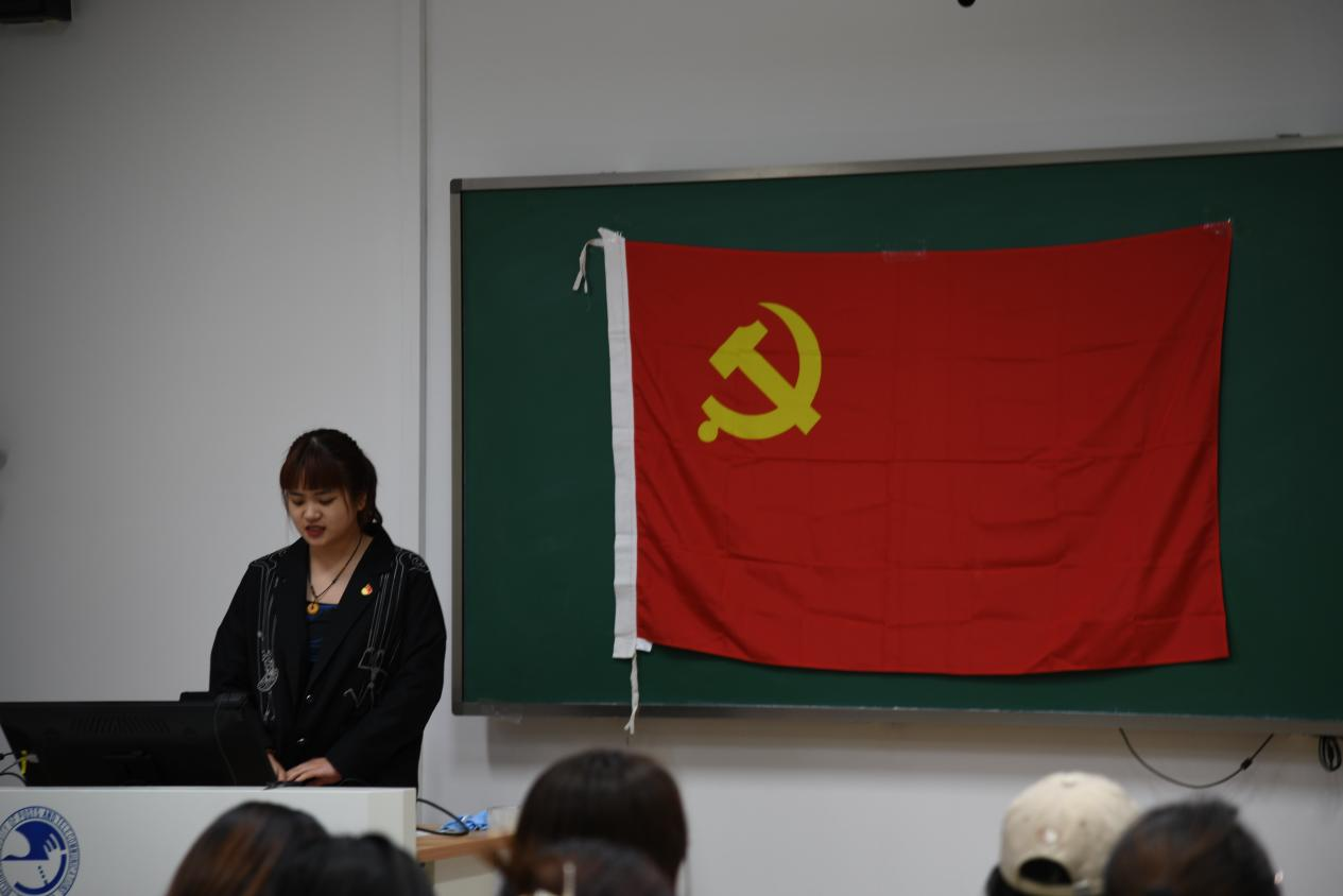 之后,支部入党积极分子刘妙韵同学以“党史精神”为主题。她从弘扬丝路精神,做“一带一路”的青春使者和塞罕坝精神两个部分给大家分享了她的学习和心得。